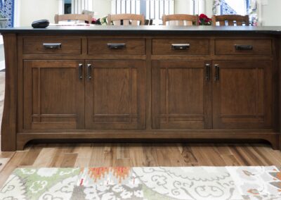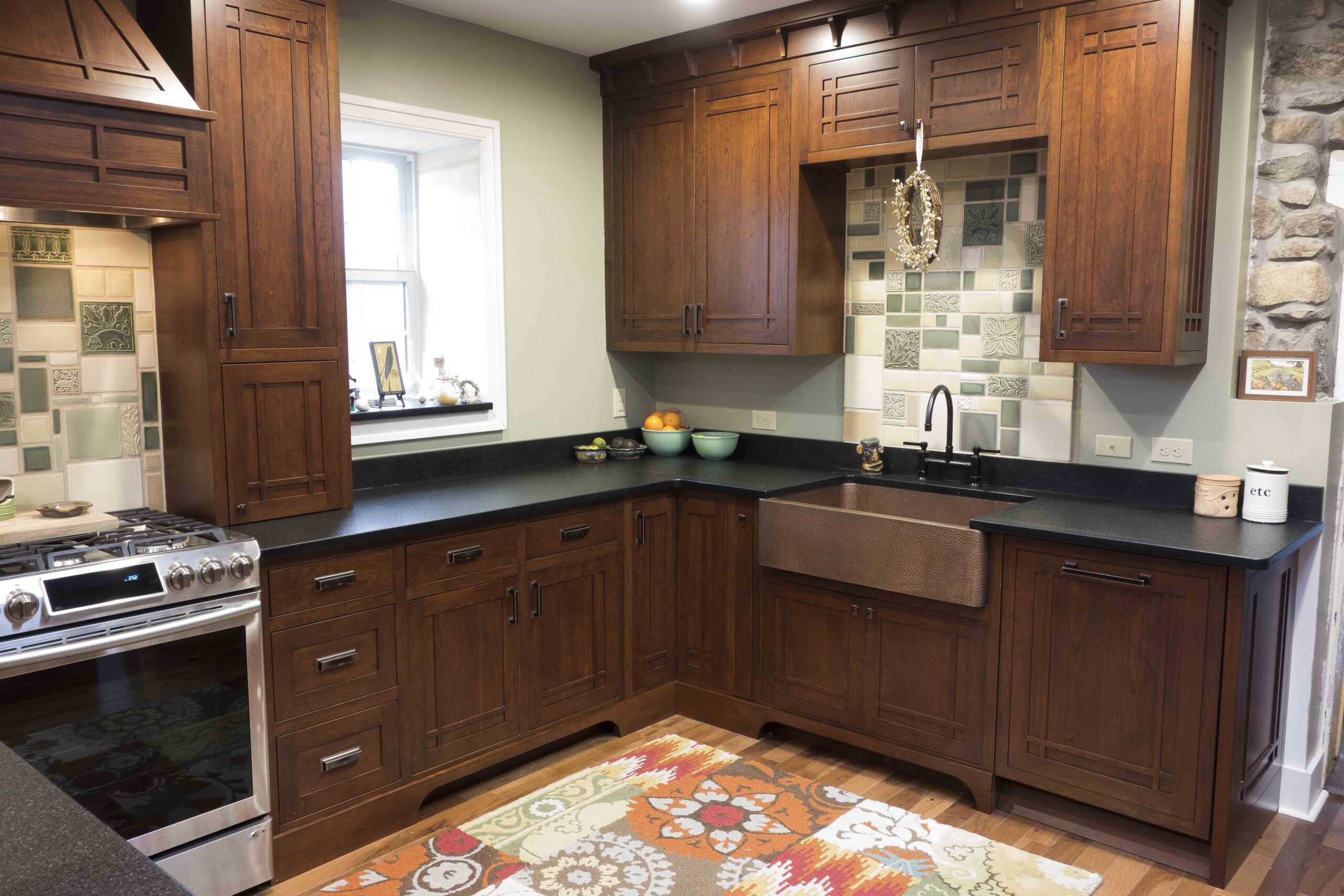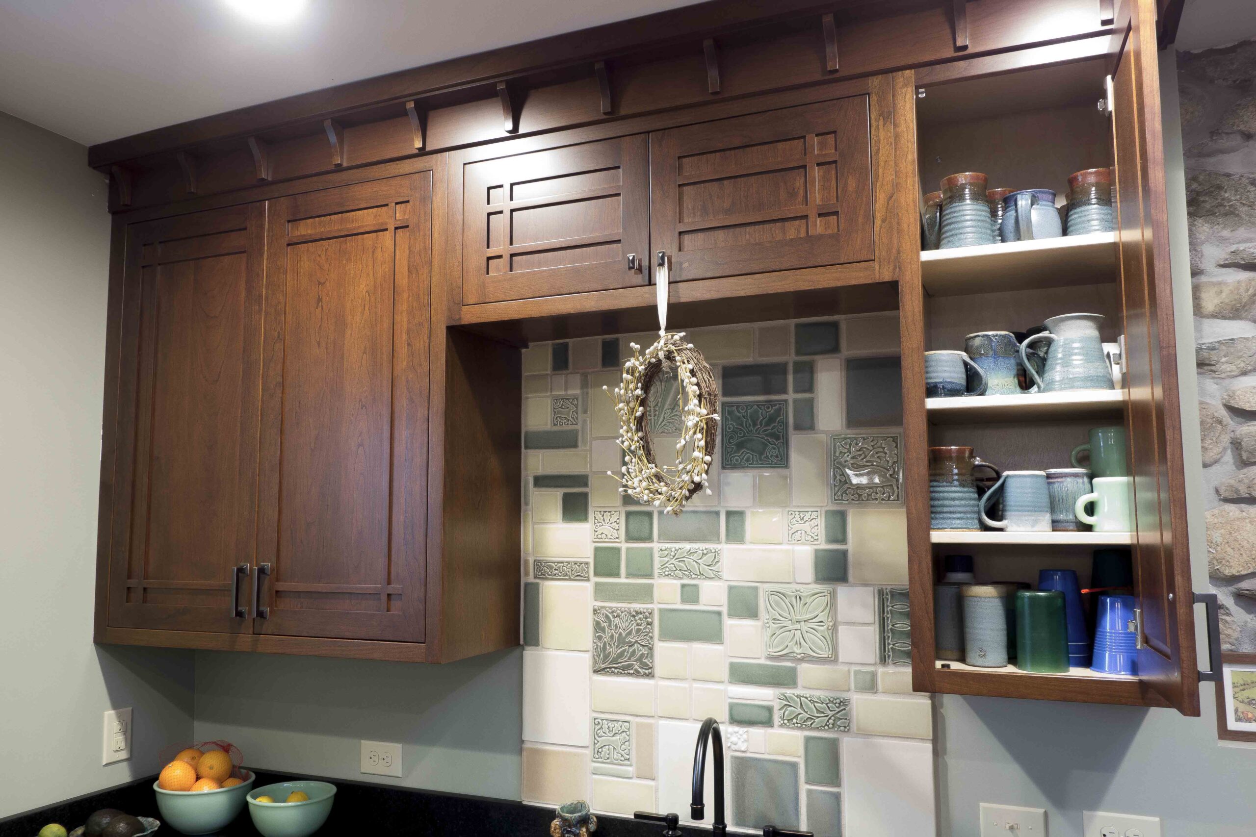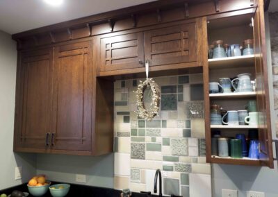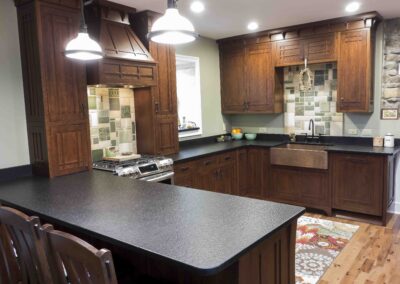 In 2016 we did a complete kitchen remodel for this 1849 farmhouse.  It features Craftsman-style doors on custom Arts & Crafts/Shaker style cabinets, all built from cherry stained New Carrington.