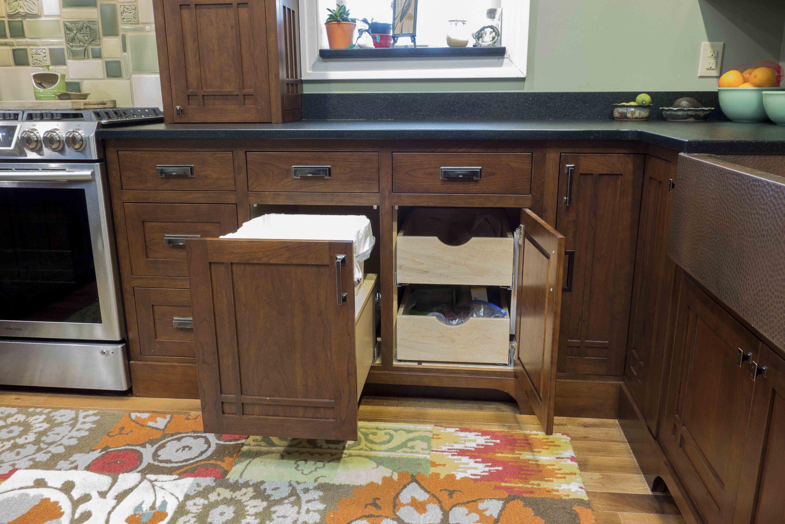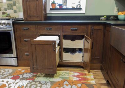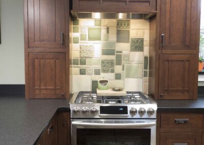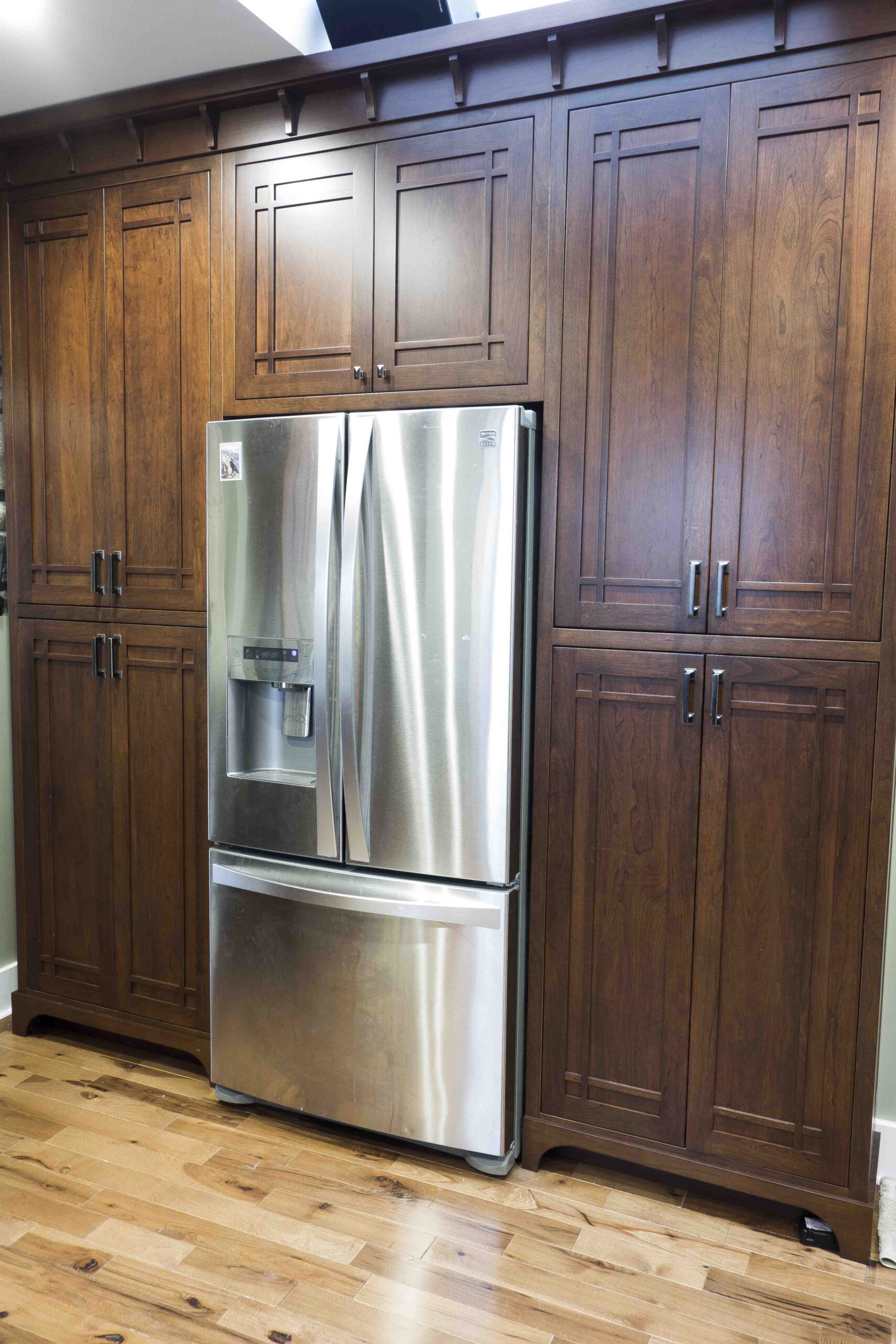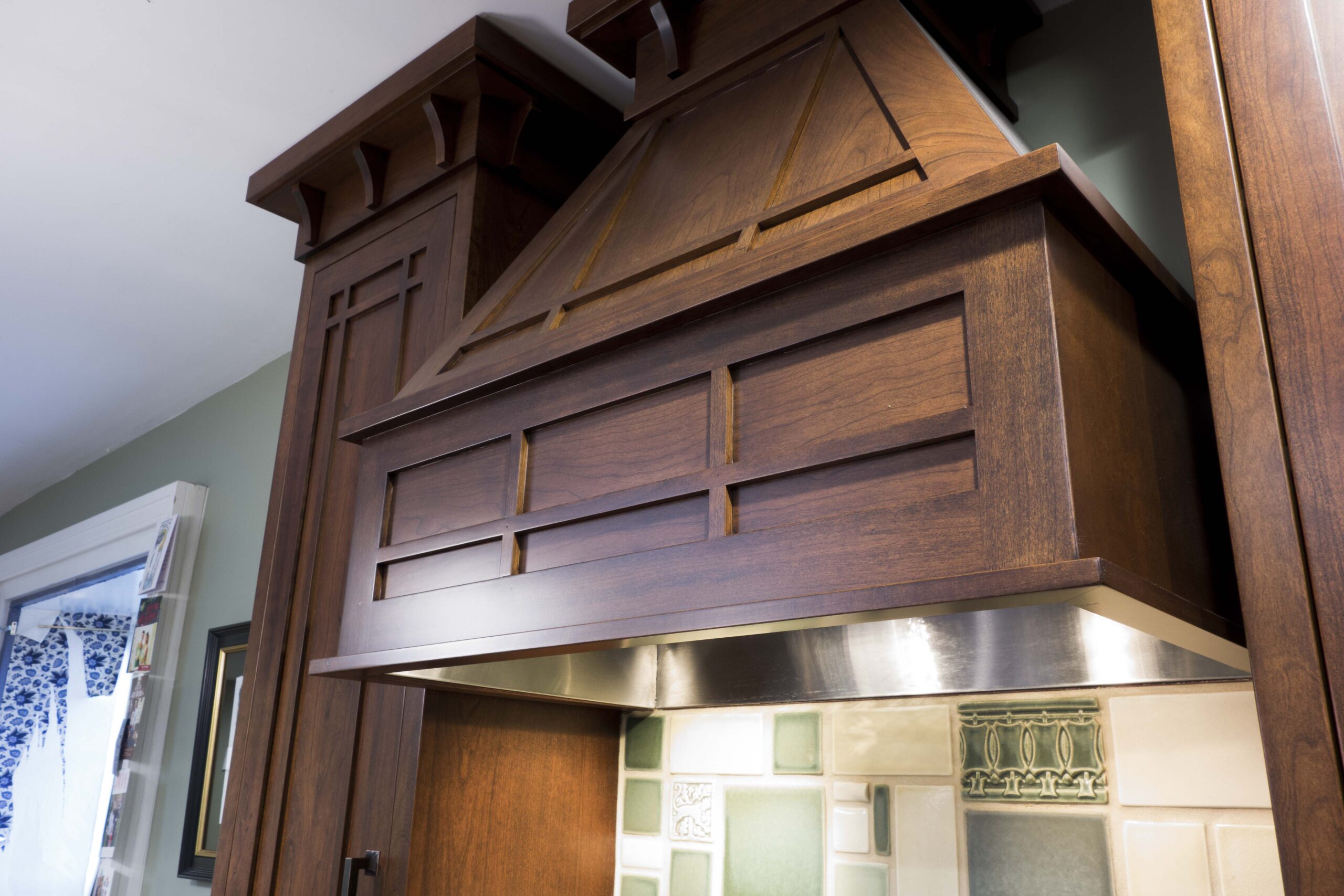 In 2016 we did a complete kitchen remodel for this 1849 farmhouse.  It features Craftsman-style doors on custom Arts & Crafts/Shaker style cabinets, all built from cherry stained New Carrington.