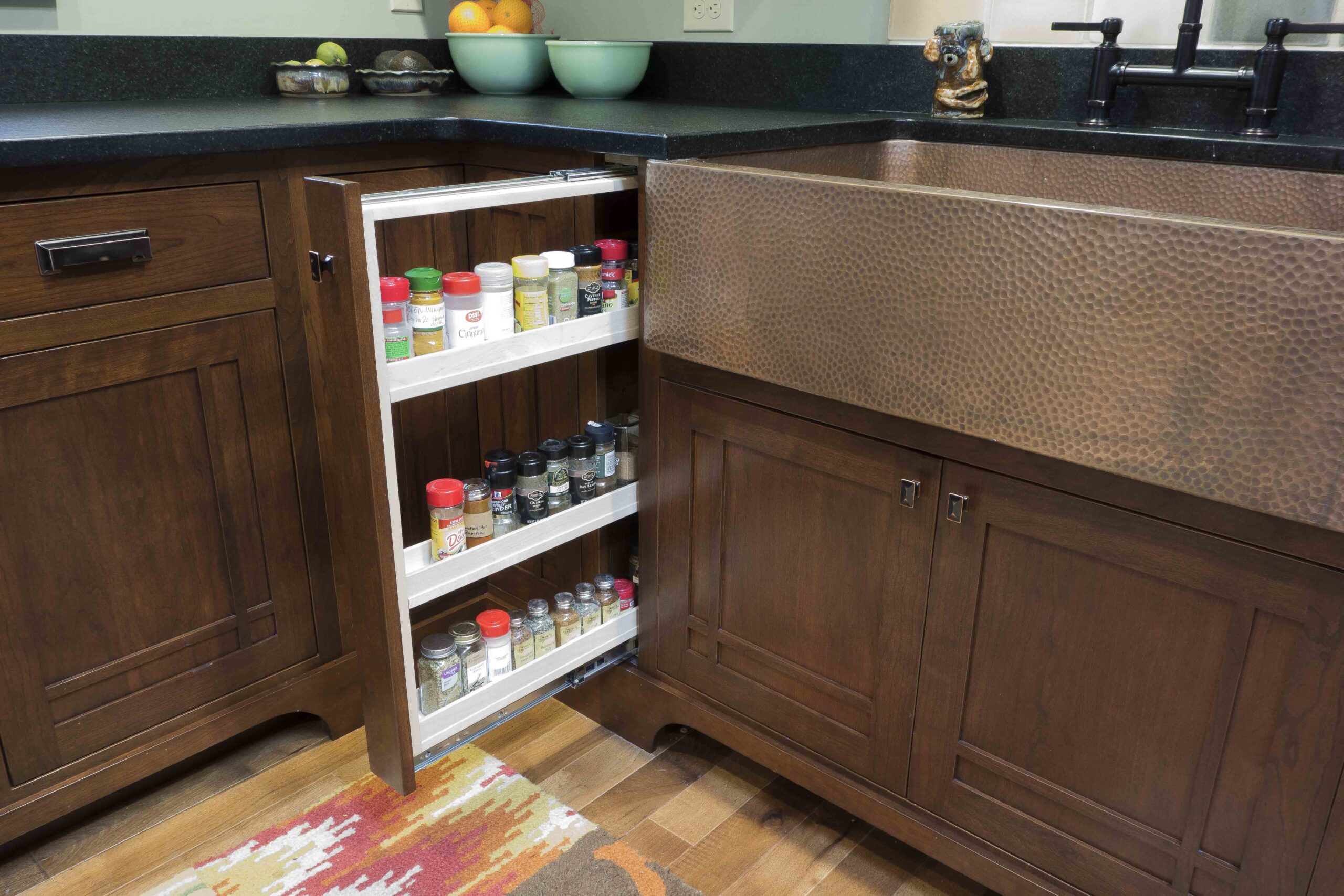 A hammered copper farm sink and textured granite top accent these exquisite cabinets with their flush insets, detailed mullions and mini corbels.  To complete the ensemble, Legacy Wood Creations crafted a custom hood and supplied matching barstools from a local furniture builder.
