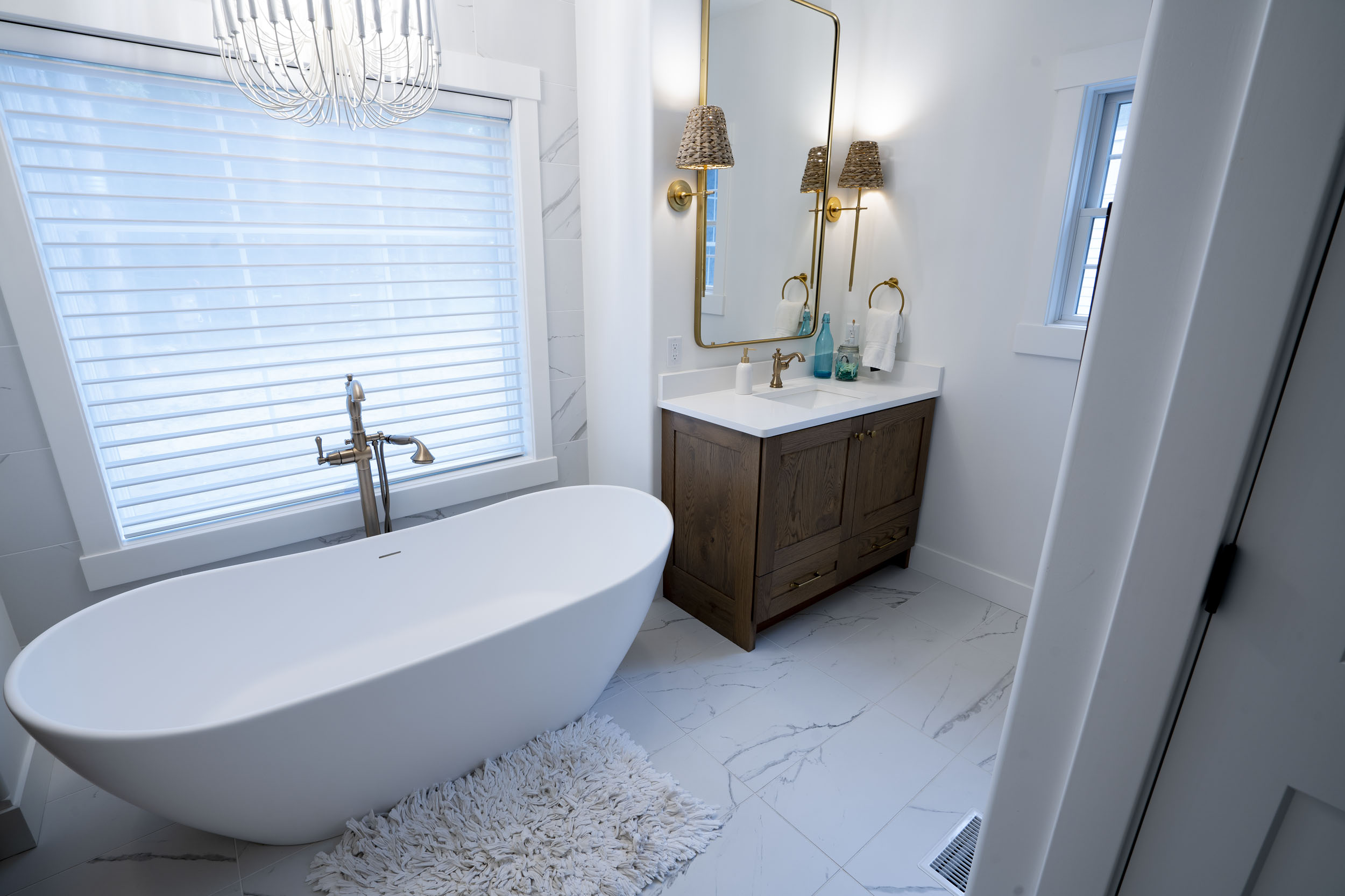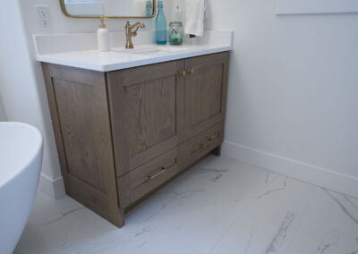 Custom-stained rustic white oak adds an aura of the antique to this marble master bath with brass fixtures.